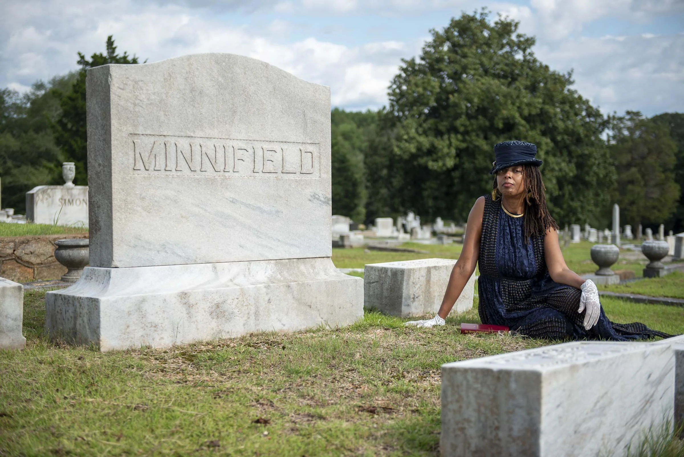 Image of Charmaine Minniefield at South-View Cemetery at the headstone of her ancestors who survived the 1906 Atlatna Race Massacre, taken by Atlanta photographer, Julie Yarbrough.