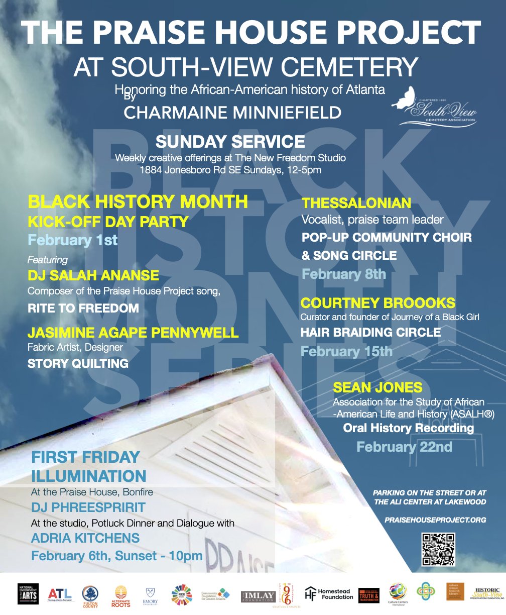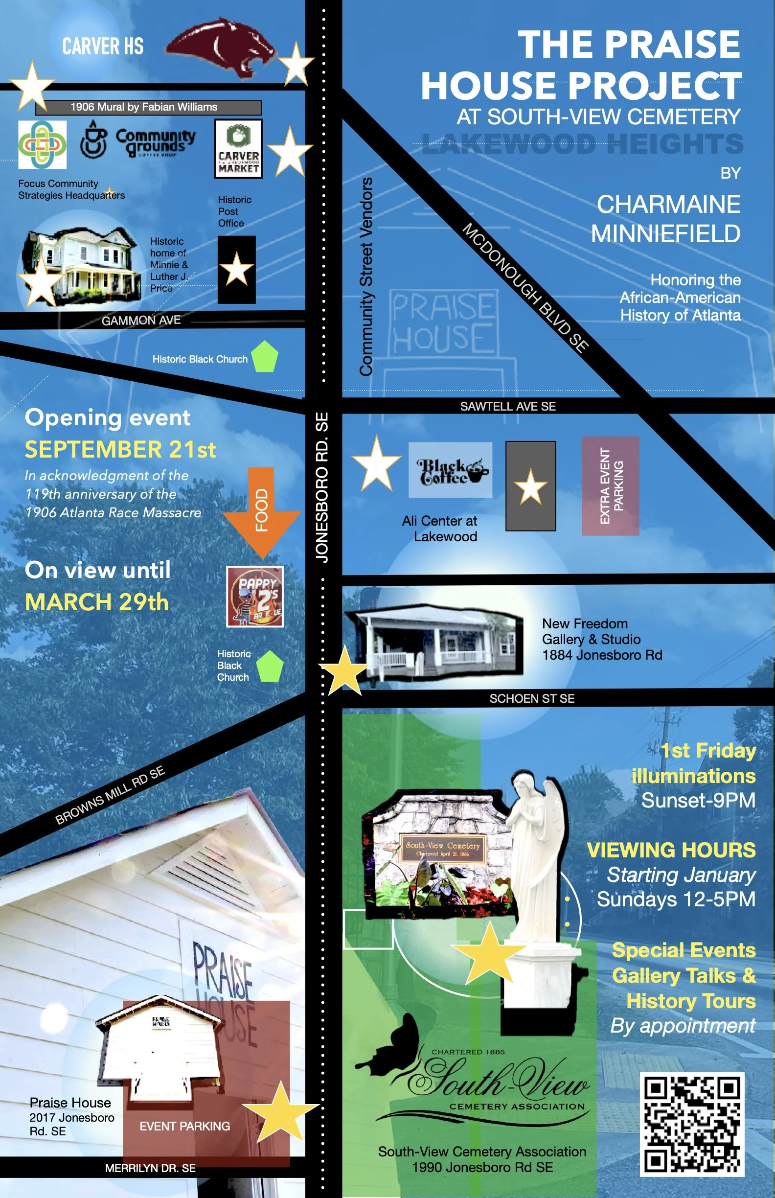 During the Praise House Project open hours, SUNDAY SERVICE is a creative love offering to the South Atlanta community, rooted in faith, wellness, community, and resistance, in acknowledgement of Atlanta’s history from the Reconstruction Era through the Civil Rights Movement, much of which rests at South-View Cemetery.