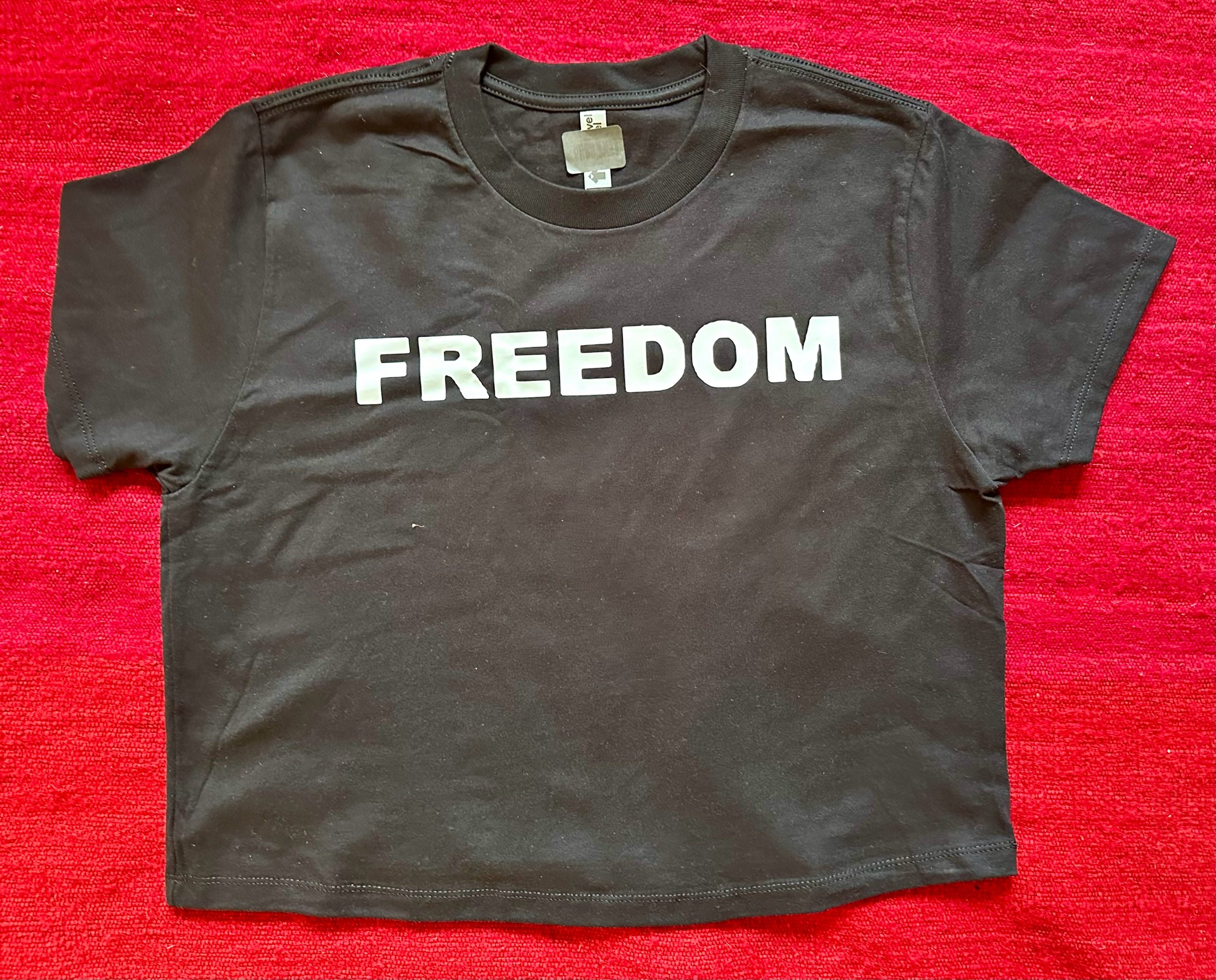 Shop › Black Freedom T Shirt Crop Top Image 1 of 2 Image 2 of 2 Black Freedom T Shirt Crop Top $25.00 %100 cotton - womens sizes Size: Small Medium Large X Large Quantity: Add To Cart Added! %100 cotton - womens sizes